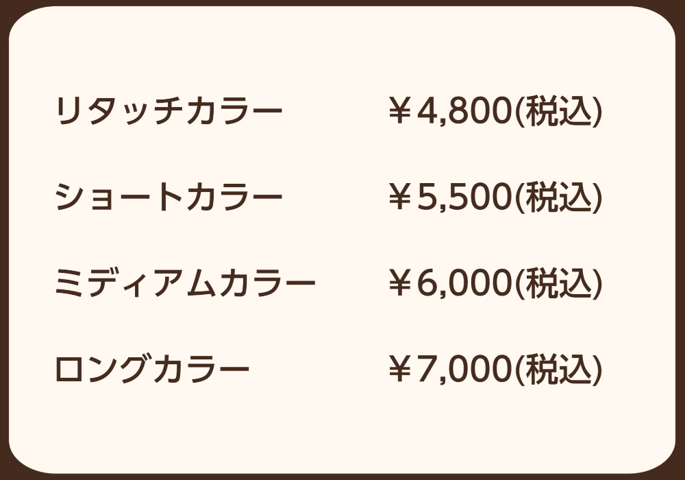 ※全体染めは、頭頂部から35cm以内をショート、頭頂部から45cm以内をミディアム、それ以上の長さをロングとさせていただきます。